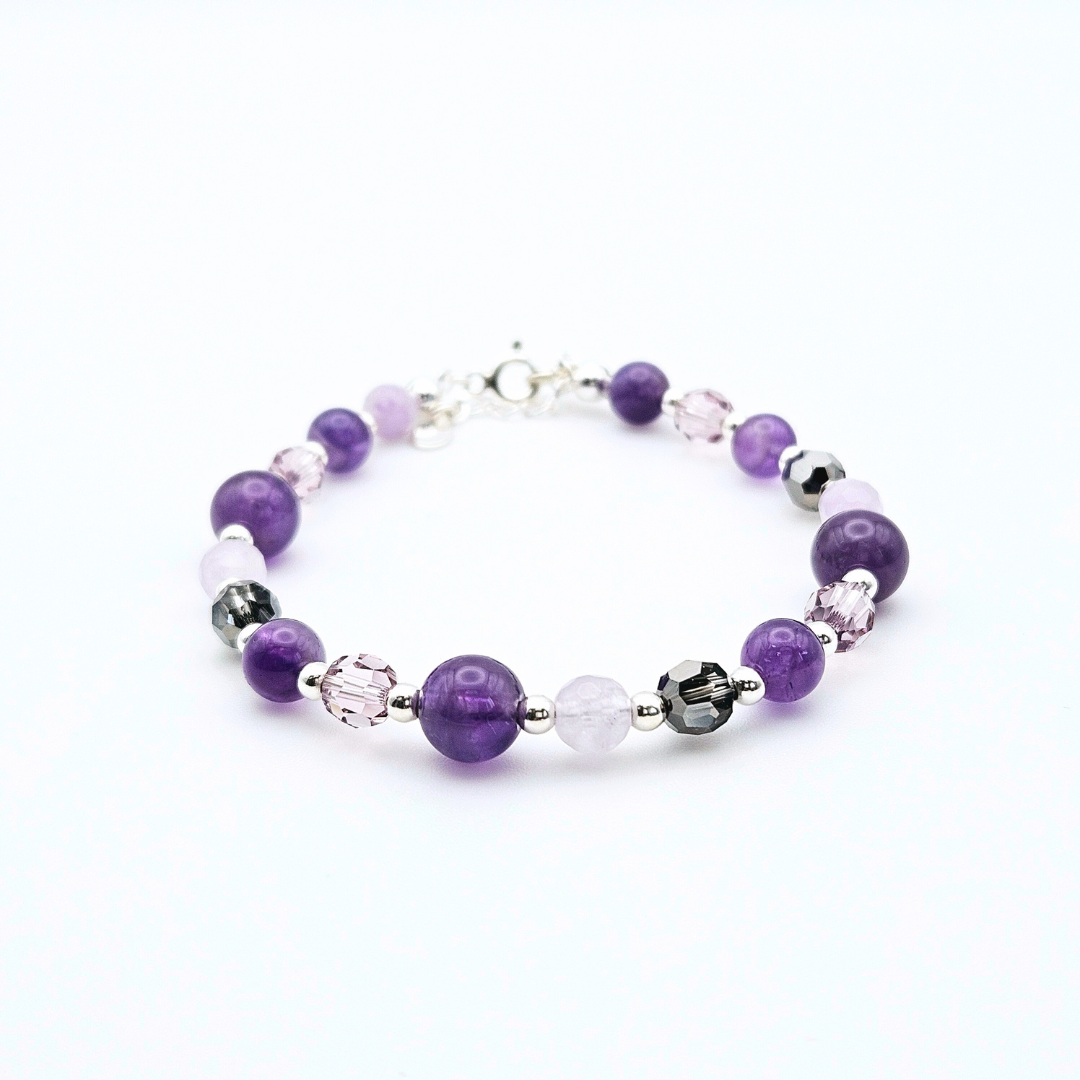 Embrace the royal hues of this enchanting bracelet, beautifully crafted with vibrant purple and soft lavender beads. The rich color spectrum ranges from deep amethyst to delicate lilac, interspersed with sparkling black and clear crystals that catch the light with every movement. It's the perfect accessory to add a pop of color to your outfit, whether you're dressing up for a special event or adding a unique touch to your everyday style.