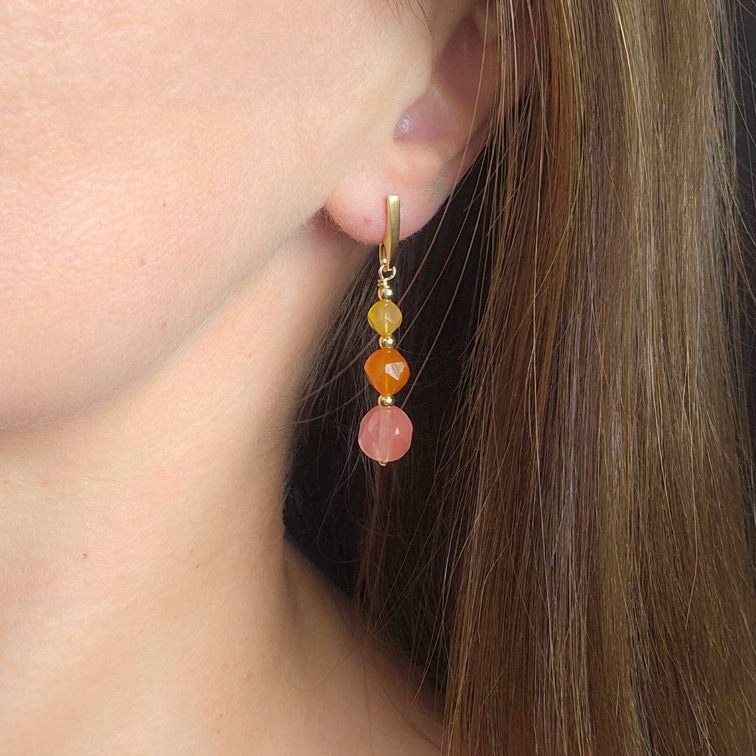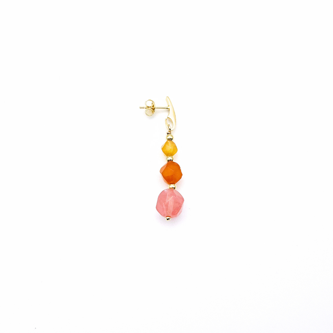 Light as laughter and glowing like the sun over volcanic clay, these earrings capture the warm essence of Barreiro da Faneca. A radiant duet of carnelian stones — one honey-toned, one deep and fiery — flows into a soft watermelon quartz drop, forming a joyful vertical gradient that echoes the red desert in bloom. Finished with 14k gold-plated hooks, they move with ease and brightness — perfect for long summer days filled with sun, color, and lighthearted energy.
