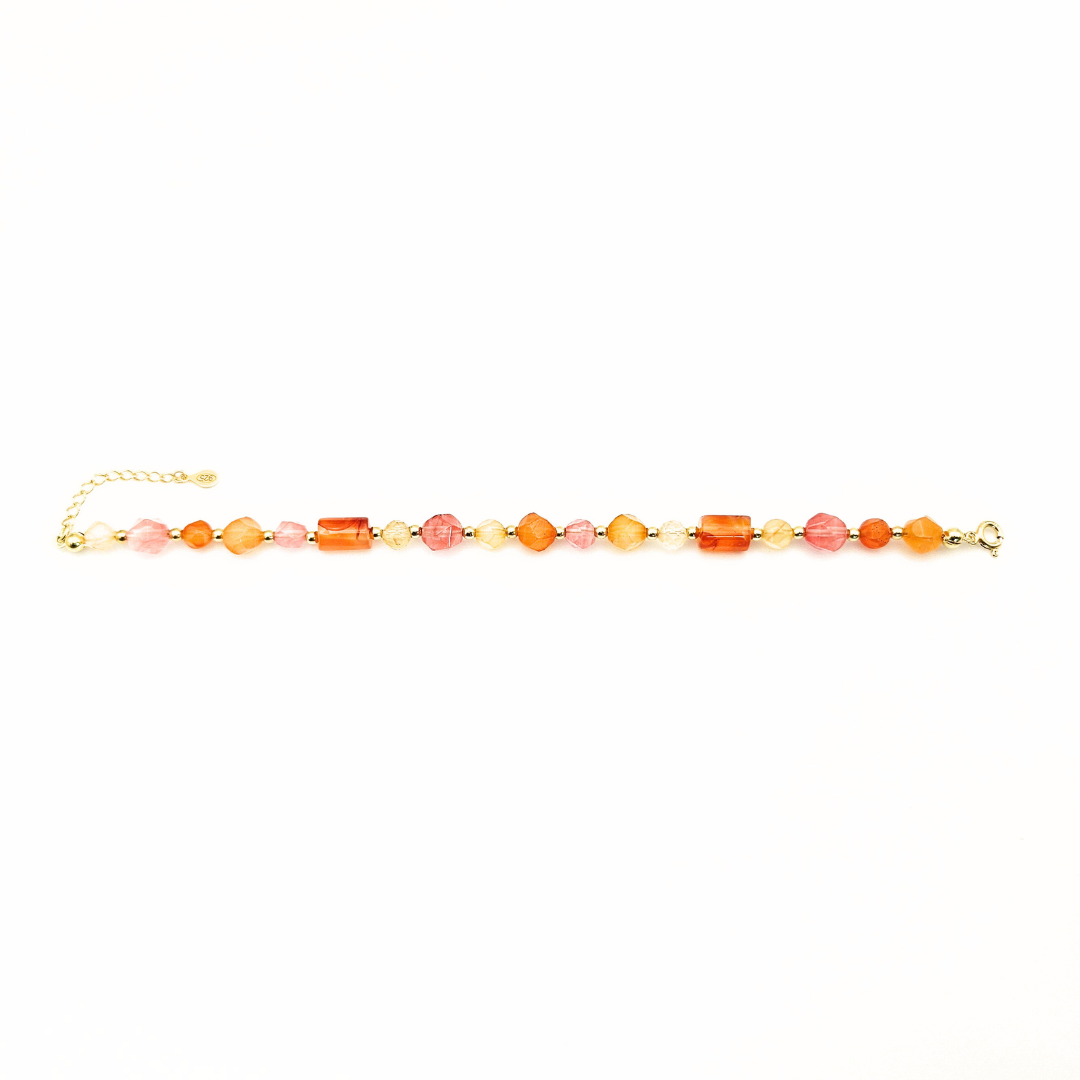 This bracelet is a joyful dance of color and form, echoing the carefree rhythm of summer days on volcanic ground. With playful contrasts between smooth rounds, faceted gems, and bold rectangular carnelian, it celebrates the ever-changing texture of Barreiro da Faneca’s sun-baked landscape. Watermelon quartz, citrine, and soft-toned agates add a juicy brightness, while 14k gold-plated beads bring glints of sunlight. Lightweight and easy to wear, it's the kind of piece that goes from beach mornings to sunset cocktails — always glowing, always moving.