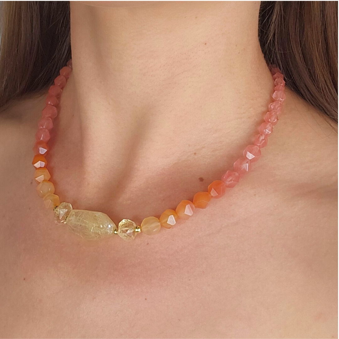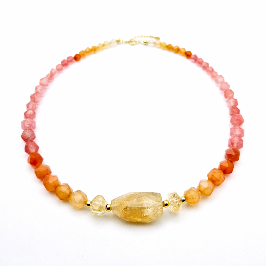 A luminous strand that echoes the gradient skies over the red desert of Santa Maria Island. This necklace blends the warmth of carnelian agate, the soft blush of watermelon quartz, and the golden heart of raw citrine. The smooth transition of tones mirrors the Barreiro da Faneca as day fades into dusk — from peachy sunlight to glowing volcanic earth. Finished with 14k gold-plated details, it’s designed to be worn under the sun, kissed by the wind, and carried into summer nights.