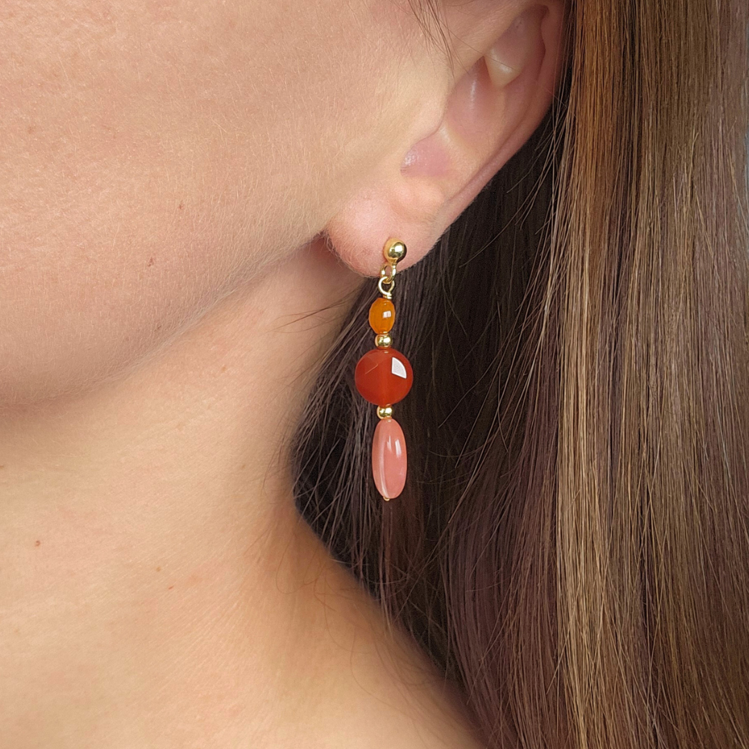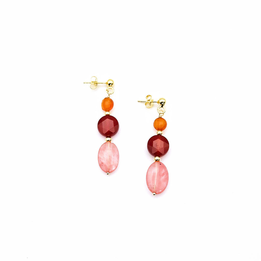 Soft yet striking, these short drop earrings pair volcanic warmth with floral grace. With golden posts, each earring features a stack of glowing carnelian, deep red agate, and petal-pink watermelon quartz. The result is a harmonious play of texture and tone — easy to wear, impossible to overlook. Lightweight and full of spirit, they're your new go-to for spring days and summer evenings alike.