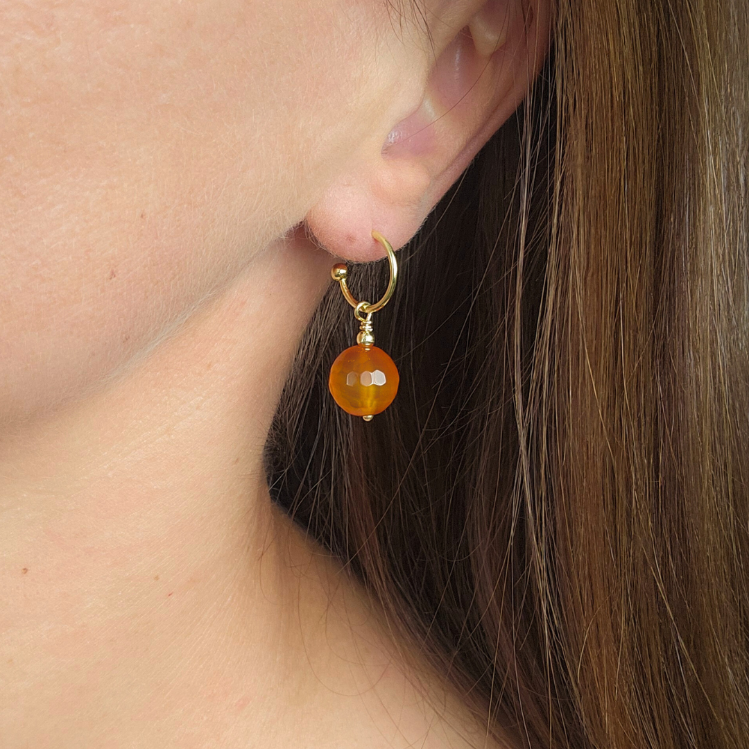 A timeless expression of warmth and clarity. These minimalist hoop earrings feature a single faceted carnelian bead — glowing like Barreiro da Faneca beneath the Azorean sun. Suspended from polished 14k gold-plated hoops, the design balances natural power with quiet refinement. Light, radiant, and endlessly versatile, this piece completes any look with effortless harmony — especially when paired with bracelets from the same collection.