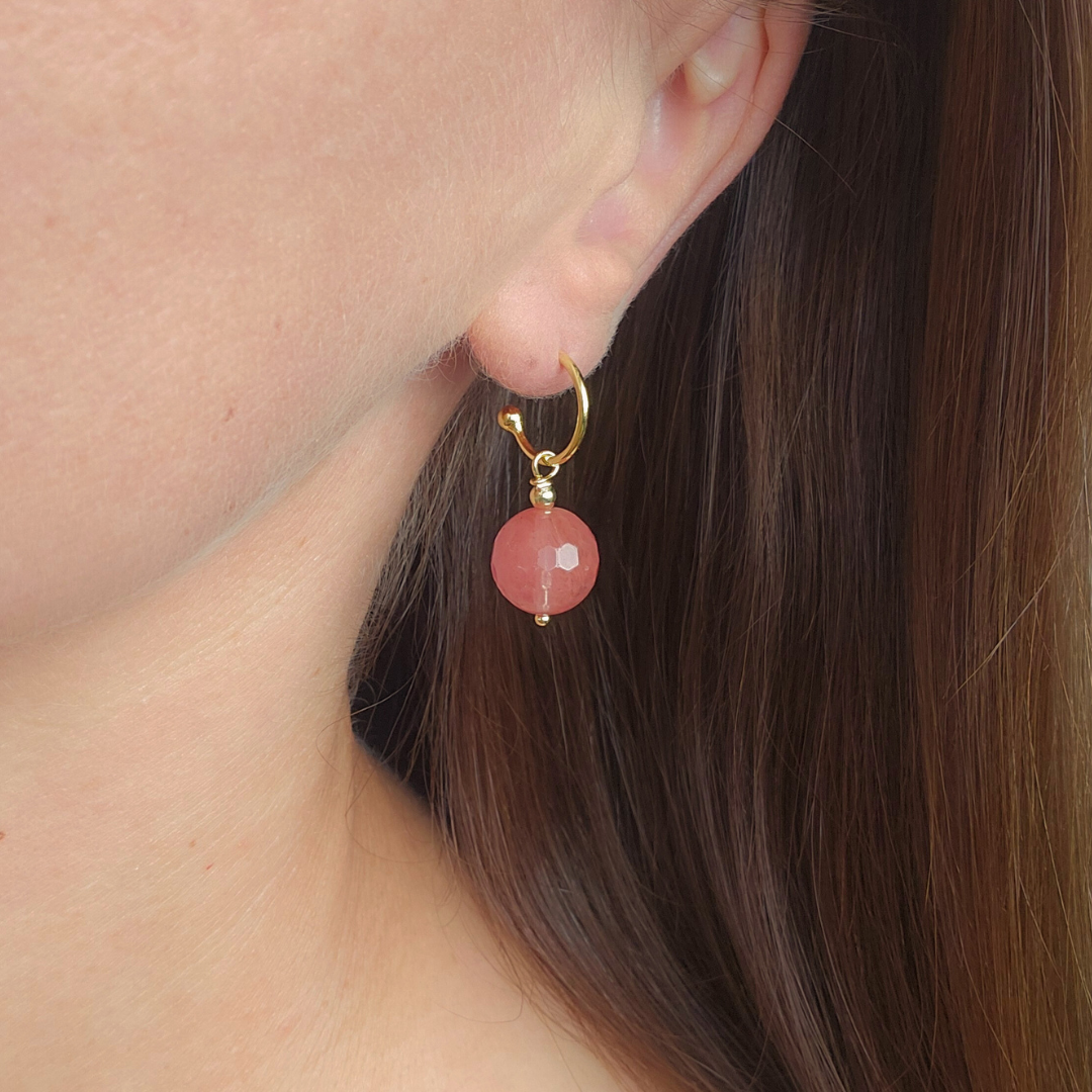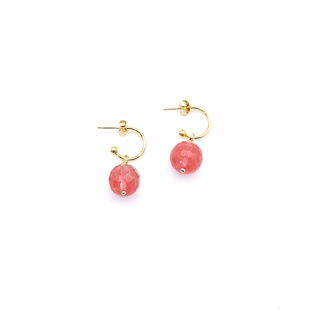 Soft, bright, and full of life, these minimalist hoop earrings feature a single faceted watermelon quartz bead — glowing like morning light over Barreiro da Faneca. The juicy pink tone brings a sense of freshness and quiet joy, suspended from sleek 14k gold-plated hoops that gently catch the light. Simple yet expressive, this design moves with ease between day and evening, and pairs beautifully with other pieces from the collection.