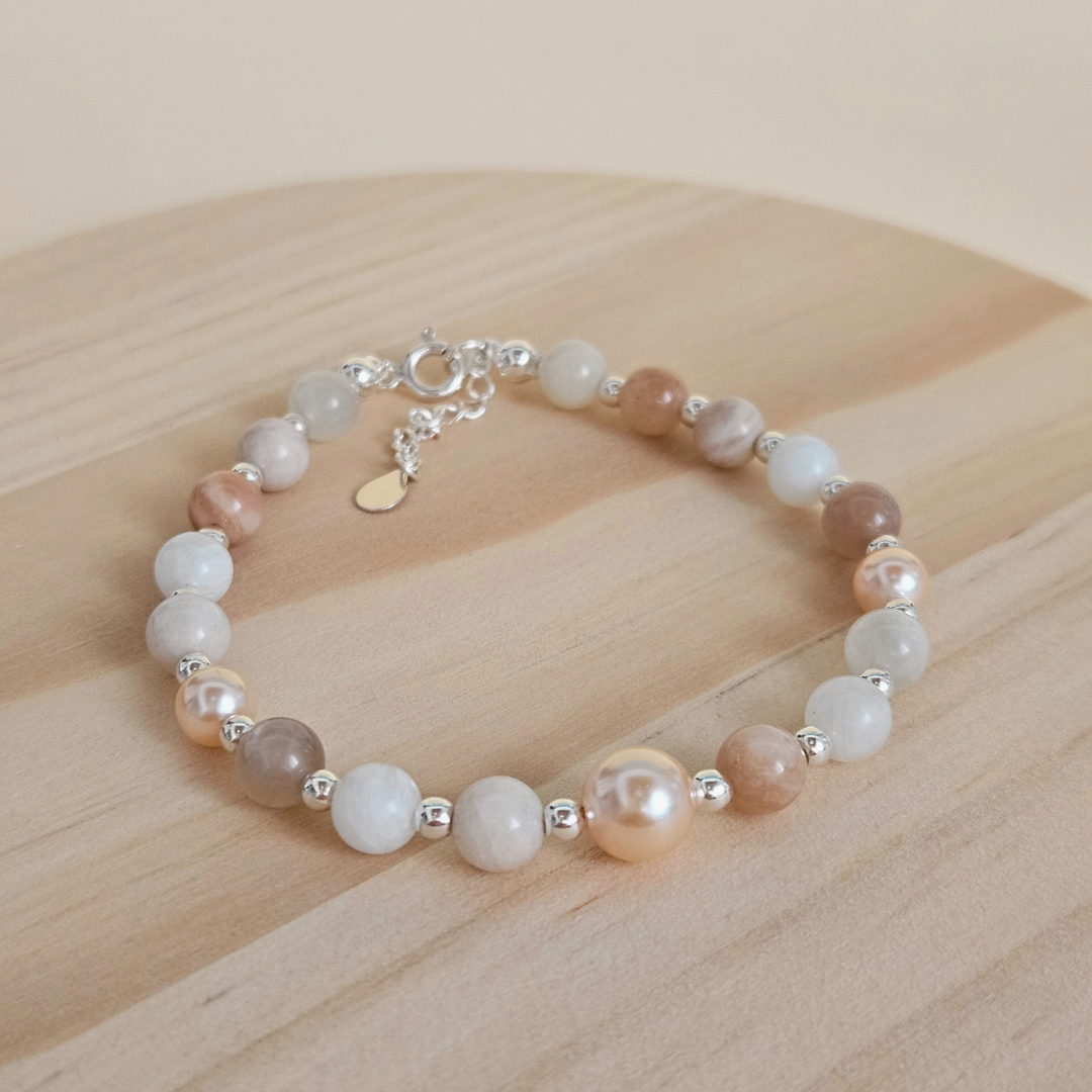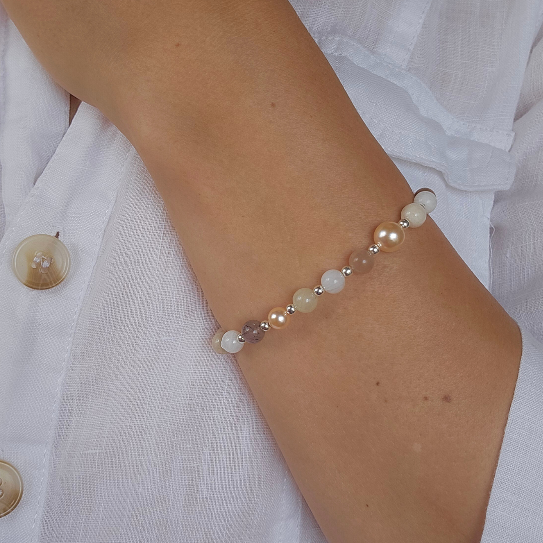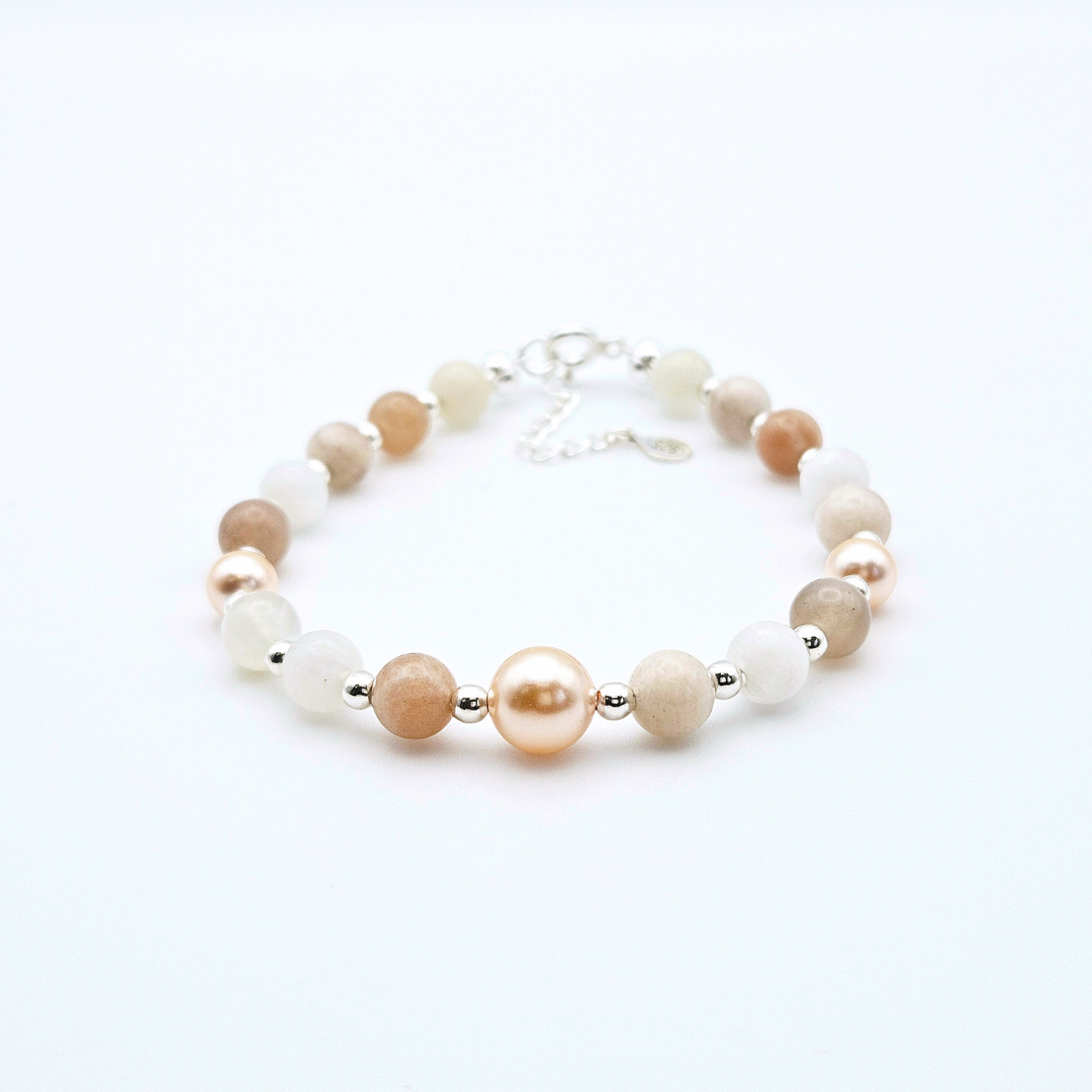Wrap your wrist in the warmth of a Portuguese café with this bracelet from the Galão Collection. Inspired by the creamy hues of your favorite coffee, it combines sunstone, moonstone, and pearls, accented with delicate sterling silver. A versatile accessory that adds a touch of elegance to your everyday style.