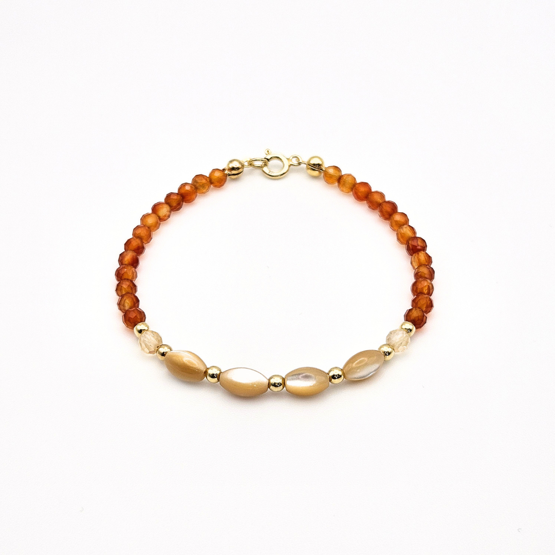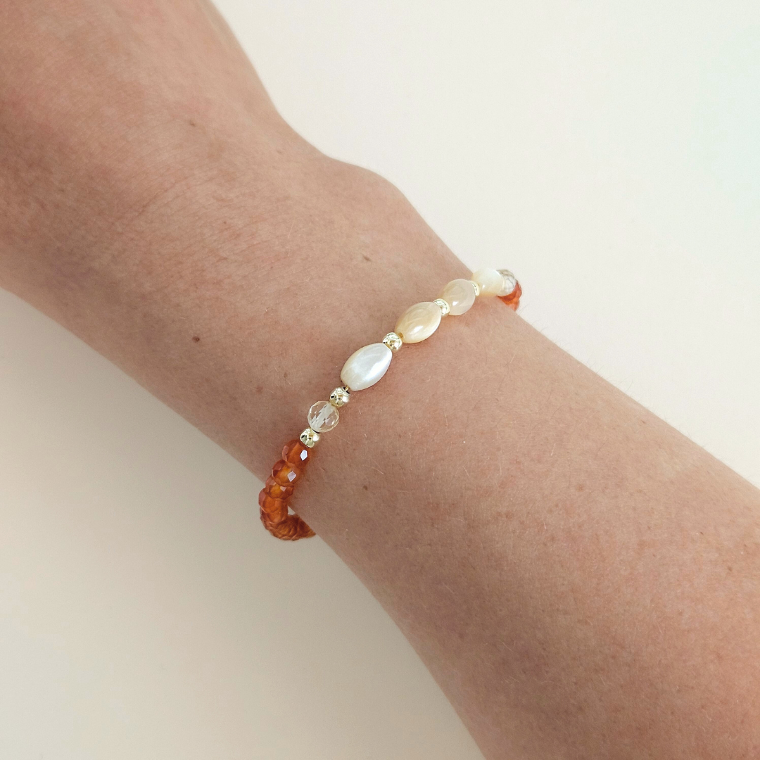 This happy bracelet glows with the colors of a summer sunset. Warm carnelian, soft citrine, and a touch of caramel mother-of-pearl create a bright, feel-good look. Light, delicate, and perfect for sunny days or golden evenings.
