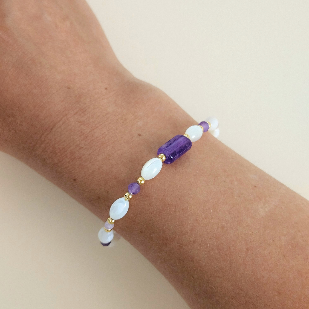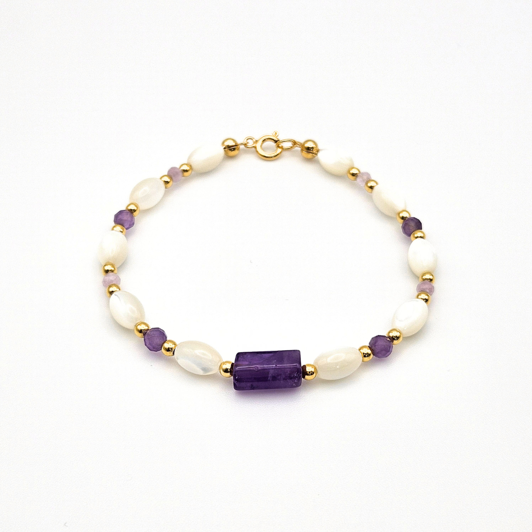 Embrace floral elegance with this delicate bracelet featuring vibrant amethyst and soft kunzite beads, reminiscent of blooming lilacs. Combined gracefully with classic white mother-of-pearl, it's a timeless addition to elevate your look—from casual afternoons to romantic evenings.