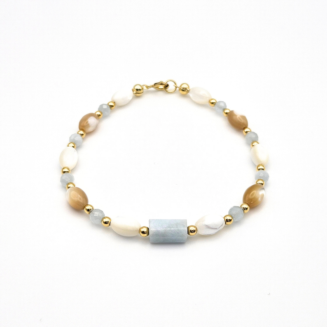 Let the clarity of the sky brighten your style with this elegant aquamarine bracelet. Gentle aquamarine stones, evoking the clear, light sky, combine gracefully with classic mother-of-pearl beads in white and caramel. Ideal for adding subtle charm to any occasion, from office chic to romantic dinners.