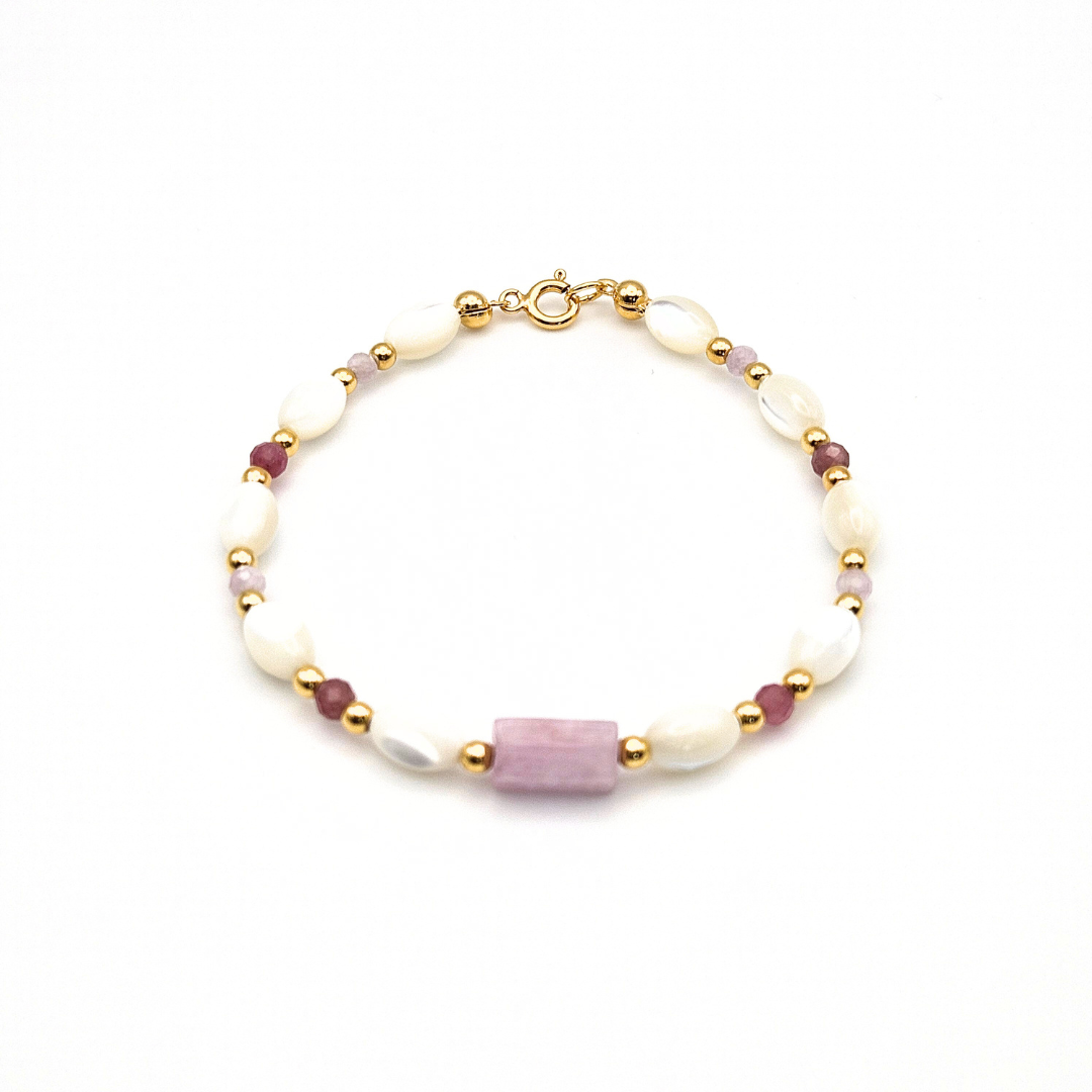 Capture the subtle beauty of blossoming gardens with this charming bracelet. Rich rubies and gentle kunzite evoke the delicate colors of fresh blooms, enhanced by timeless white mother-of-pearl beads. Effortlessly elegant for both daily wear and special occasions.