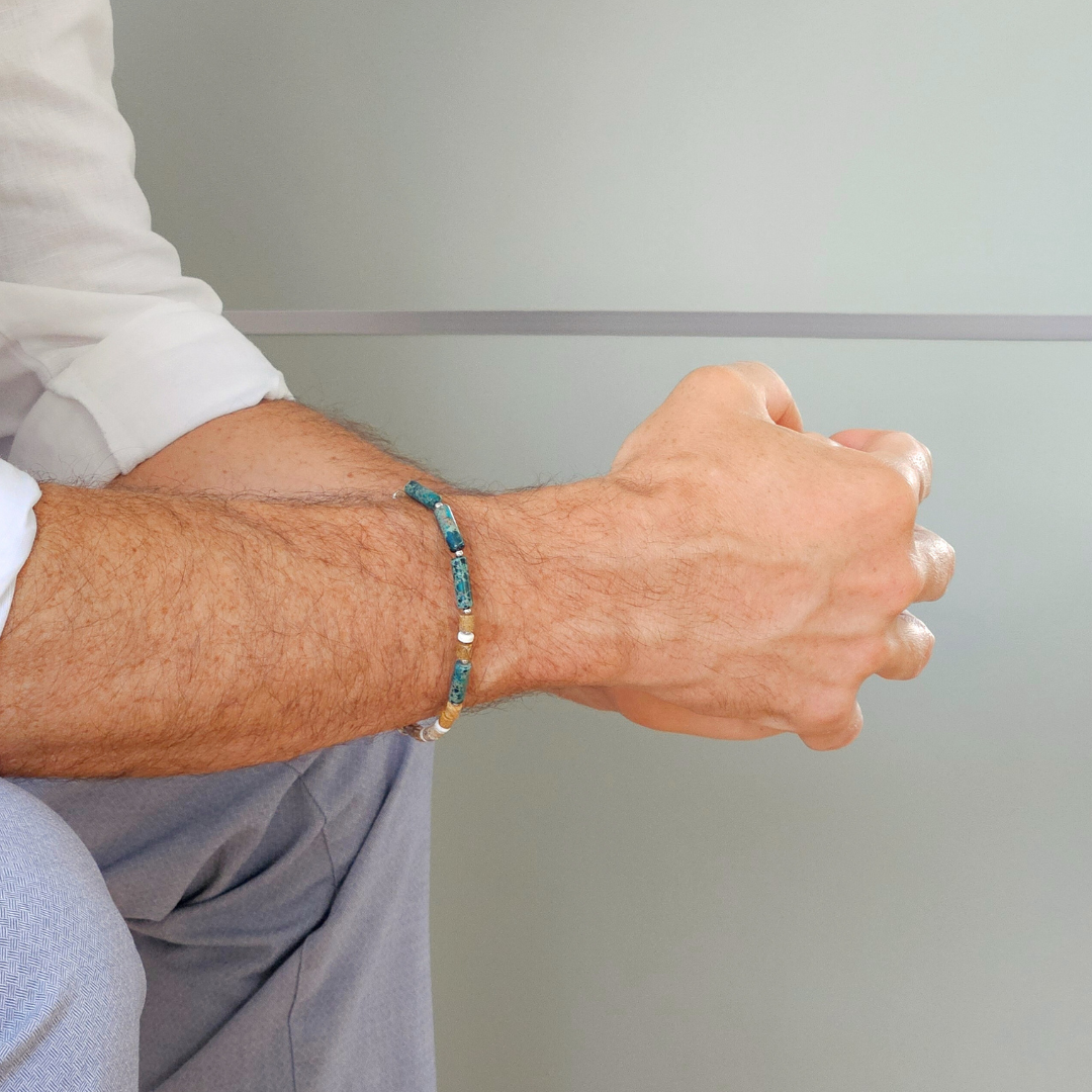 Natural Jasper stones in bold earth tones meet stainless steel for a clean, rugged look. Lightweight and versatile, it’s made to move with you — from city days to off-grid escapes.