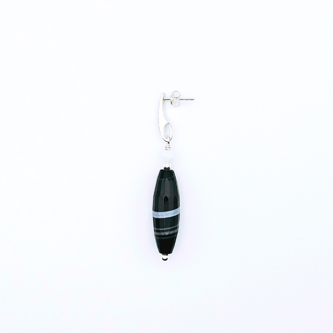 These captivating earrings feature sleek black agate elegantly accented by luminous moonstones. The silver-tone hooks add a modern twist, ensuring these earrings hang beautifully and catch the light with every turn. Perfect for adding a sophisticated flair to any outfit, they are sure to become a cherished part of your jewelry collection.