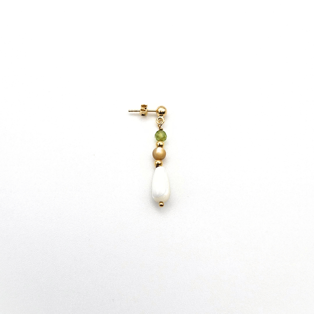 These light and elegant earrings combine green olivine, caramel mother-of-pearl, and a soft white drop. A subtle, natural accent — perfect on their own or as a set with the matching necklace and bracelet.