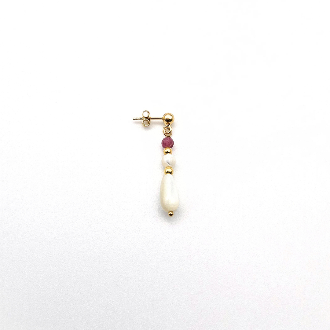 These earrings mix deep ruby with soft mother-of-pearl and a classic drop shape. A feminine and timeless piece — perfect to wear solo or with the matching bracelet.